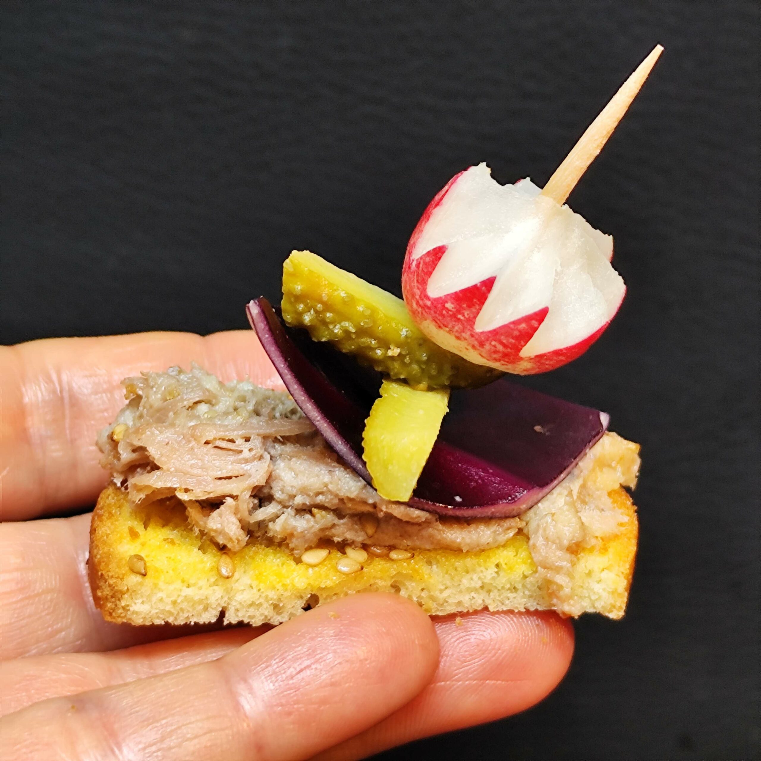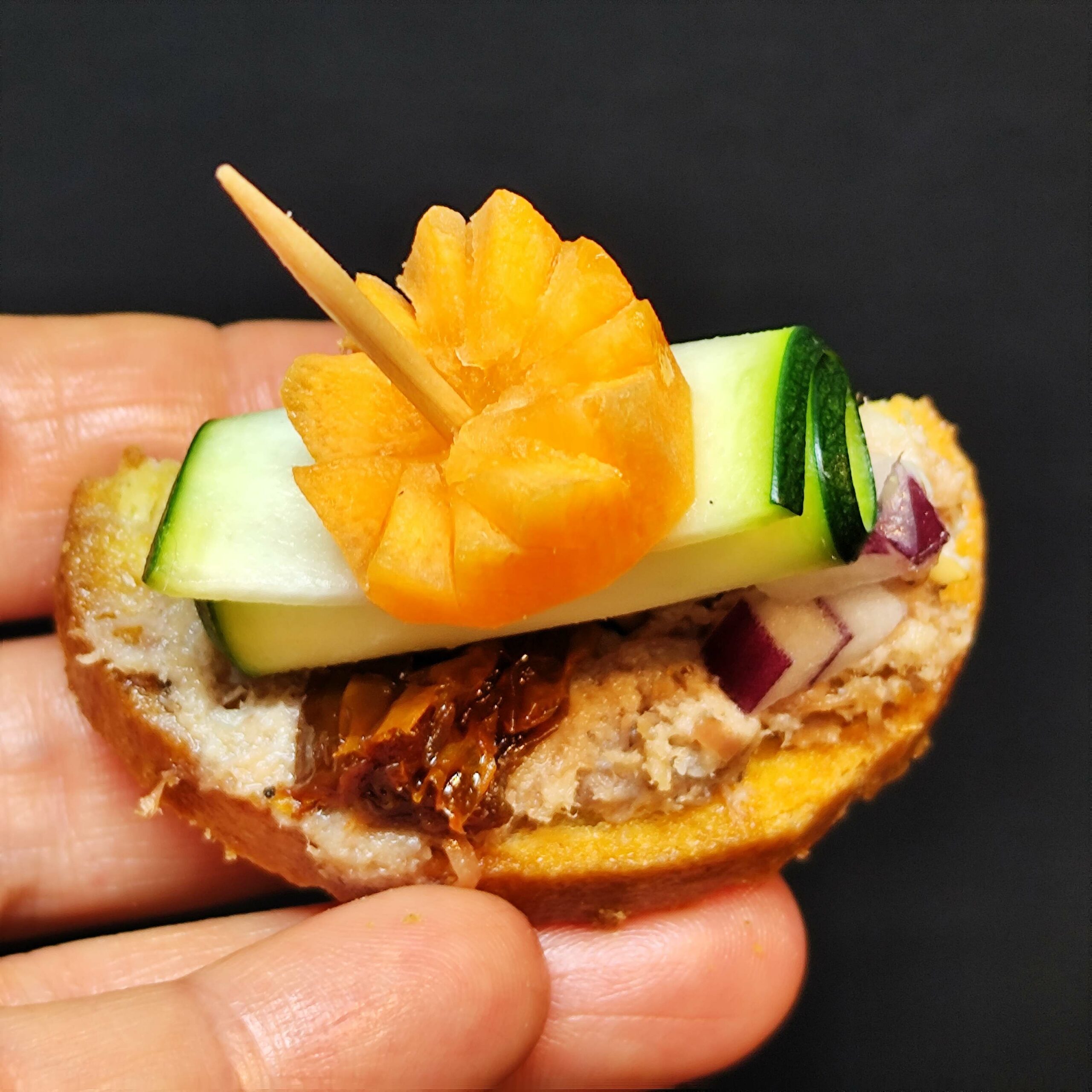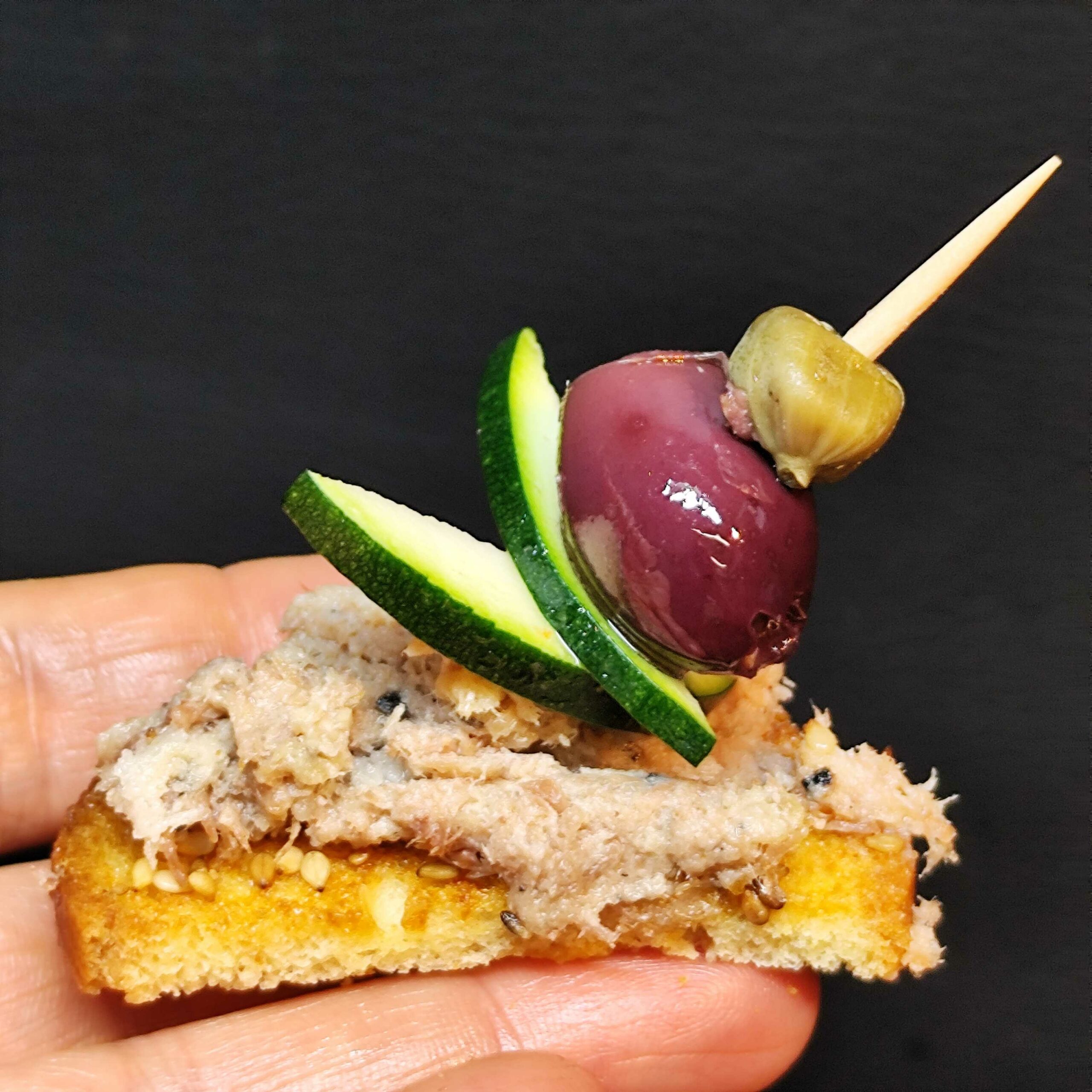 Tartines cocktails fraîches & gourmandes prêtes à déguster, élégantes et subtilement équilibrées, sur des toasts croustillants à l’huile d’olive bio et aux graines de sésame bio ; Contenant écologique RSE